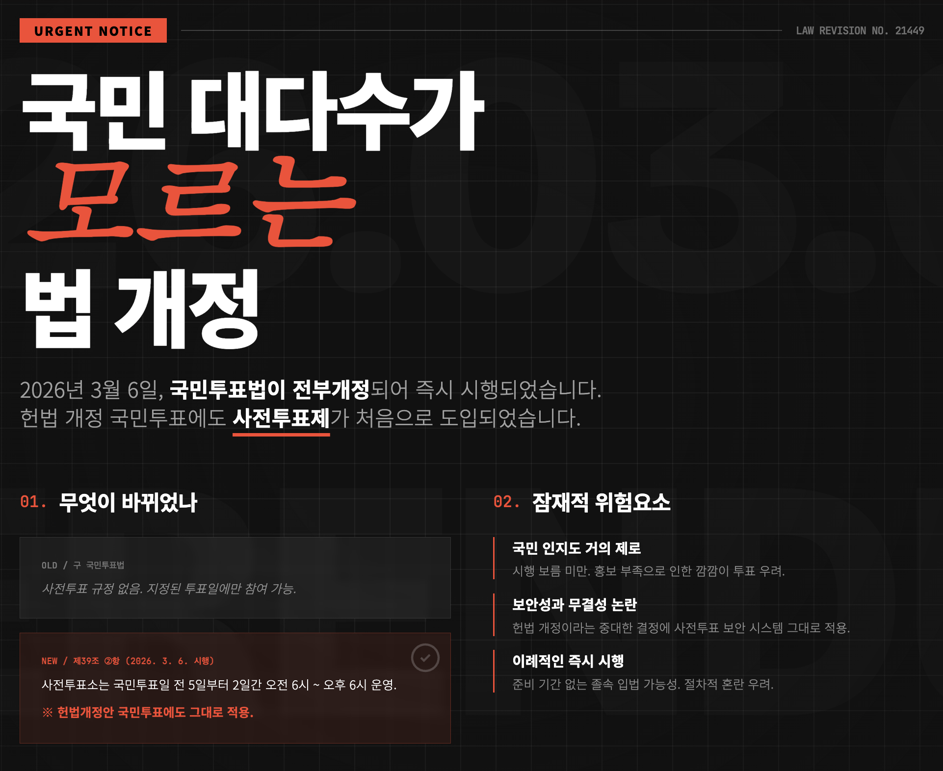 국민투표법은 2026년 3월 6일 전부개정되어 당일 즉시 시행되었습니다. 이처럼 중요한 선거·투표 절차법이 공포와 동시에 시행되는 것은 이례적입니다. 충분한 준비 기간·시행령 정비 없이 헌법개정 국민투표가 실시될 경우 절차적 혼란이 우려됩니다.