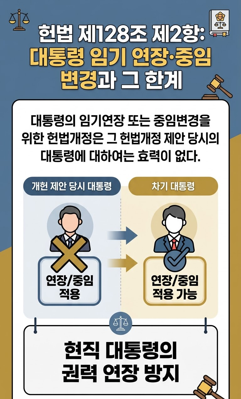 즉 제128조 제2항은 단순한 부칙적 기술조항이 아니라, 헌정사적 반성과 권력분립 원리에 기초한 통제규범이다. 대통령이 헌법개정권에 참여하더라도, 그 개헌을 통해 스스로의 권력기반을 연장하는 것은 허용되지 않는다는 선언이다.